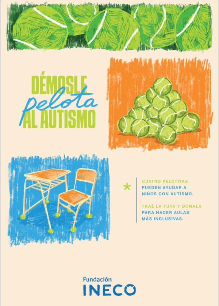 Fundación INECO continúa con la campaña “Démosle pelota al autismo”, esta iniciativa propone recolectar pelotas en desuso de tenis para atenuar los ruidos en las aulas poniéndolas en las patas de las sillas y bancos. De esa manera, crean un entorno más amigable para los chicos y chicas con autismo y otras condiciones del neurodesarrollo.